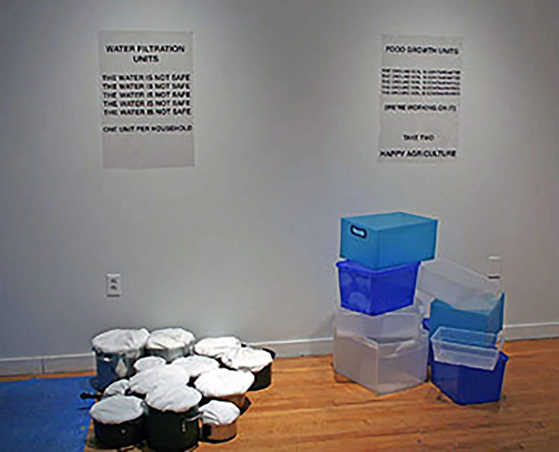 Aftermath Homestead is an imagined space, a plastic future replete with government propaganda, plant incubators, water filtration, and housing. Through science-fiction and world-building a possible, though dystopic, future can be explored. This installation contains all the basics required for life, but asks the viewer to imagine both what took place to create this world, and what it would take to truly survive in a world based entirely around plastics.