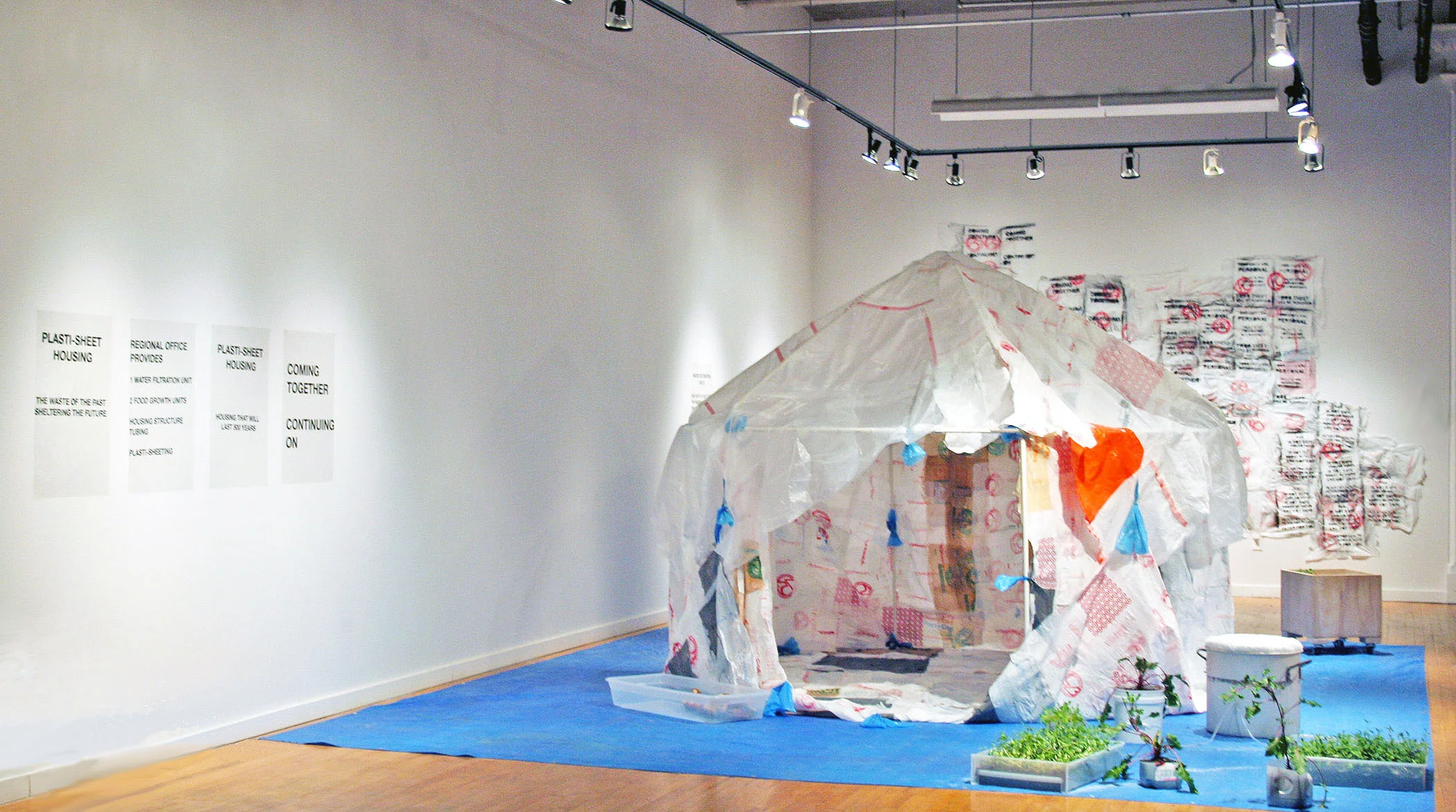 2014, plastic bags, vinyl, spray paint, edible plants, wood, tarp, water.
